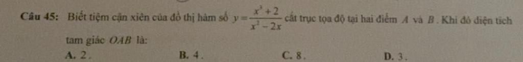 Ta có: `{:(a=lim_(x-> +oo) (f(x))/x=1),(b=lim_(x-> +oo) [f(x)-x]=2):}}`