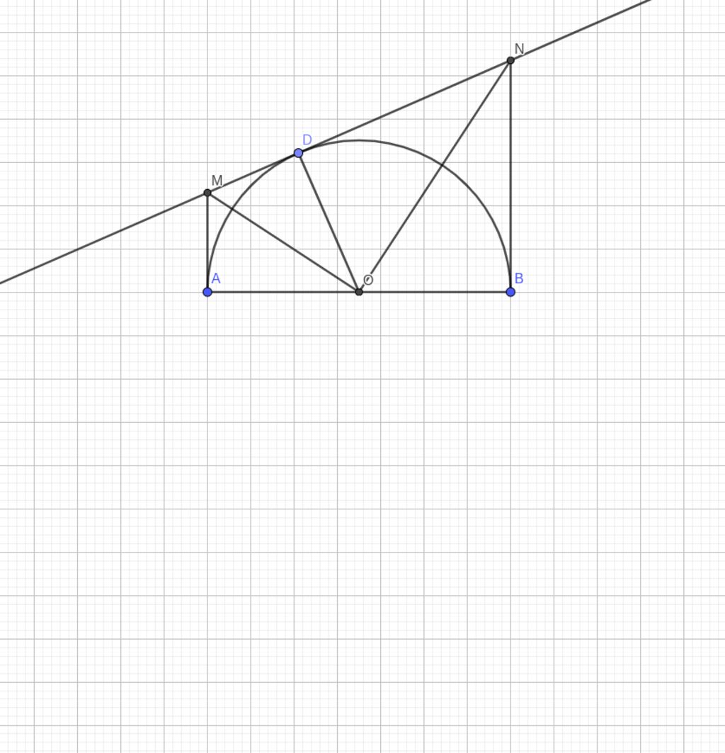 cho nửa đường tròn (O), đường kính AB.Về cùng phía với nửa đường tròn, vẽ hai tia Ax,By vuông góc với Ab. Gọi M là một điểm bất kì thuộc tia Ax.Qua M kẻ tiếp tuyến với nửa đường tròn,cắt By tại N