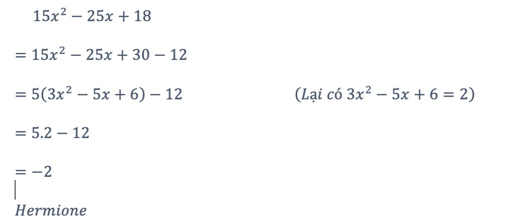 3x^2 - 5x + 6 = 2=> 5.( 3x^2 - 5x + 6 ) = 5.2=> 15x^2 - 25x + 30 = 10=> 15x^2 - 25x + 18 = -2