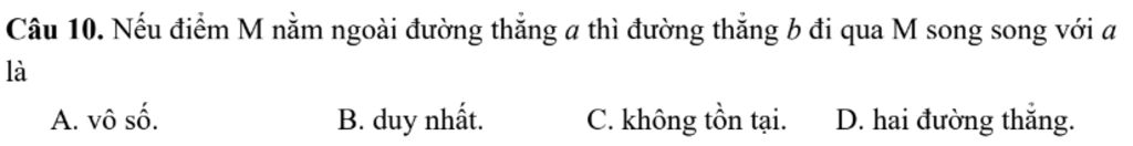 Qua một điểm nằm ngoài một đường thẳng chỉ có một duy nhất một đường thẳng song song với đường thẳng đó.
