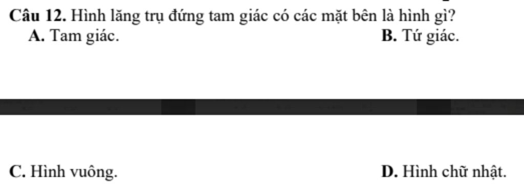 Câu 12. Hình lăng trụ đứng tam giác có các mặt bên là hình gì? A. Tam giác. B. Tứ giác. C. Hình vuông. D. Hình chữ nhật.