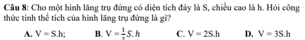 `->` Công thức tính thể tích của hình lăng trụ đứng là: