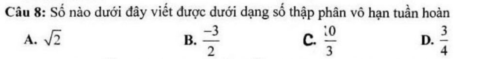 `C. 10/3=3,333...=3,(3)=>` Vô hạn tuần hoàn