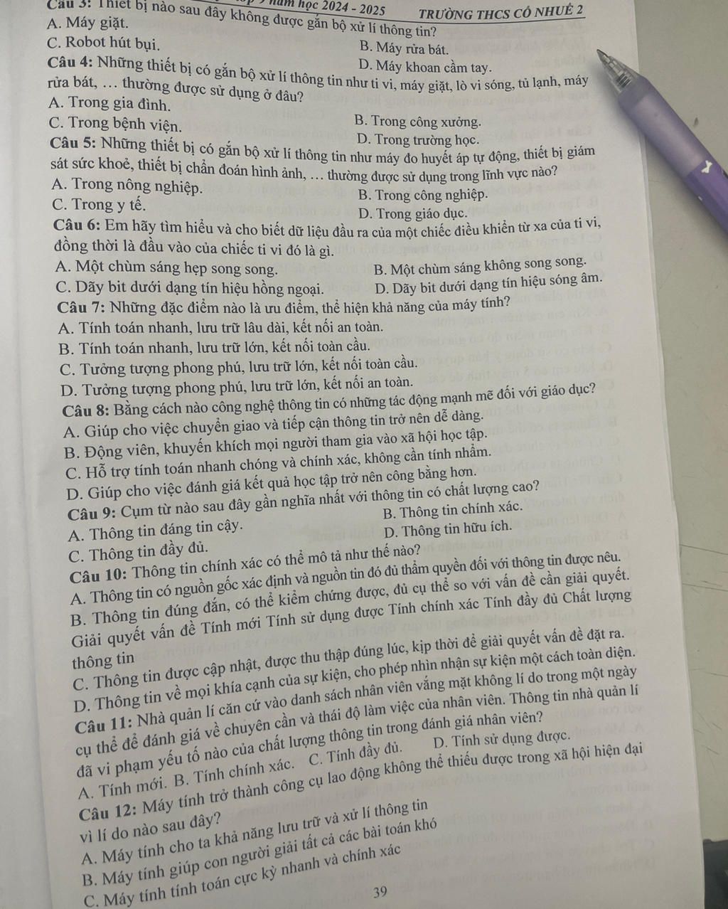 Câu 7:B. Tính toán nhanh, lưu trữ lớn, kết nối toàn cầu.