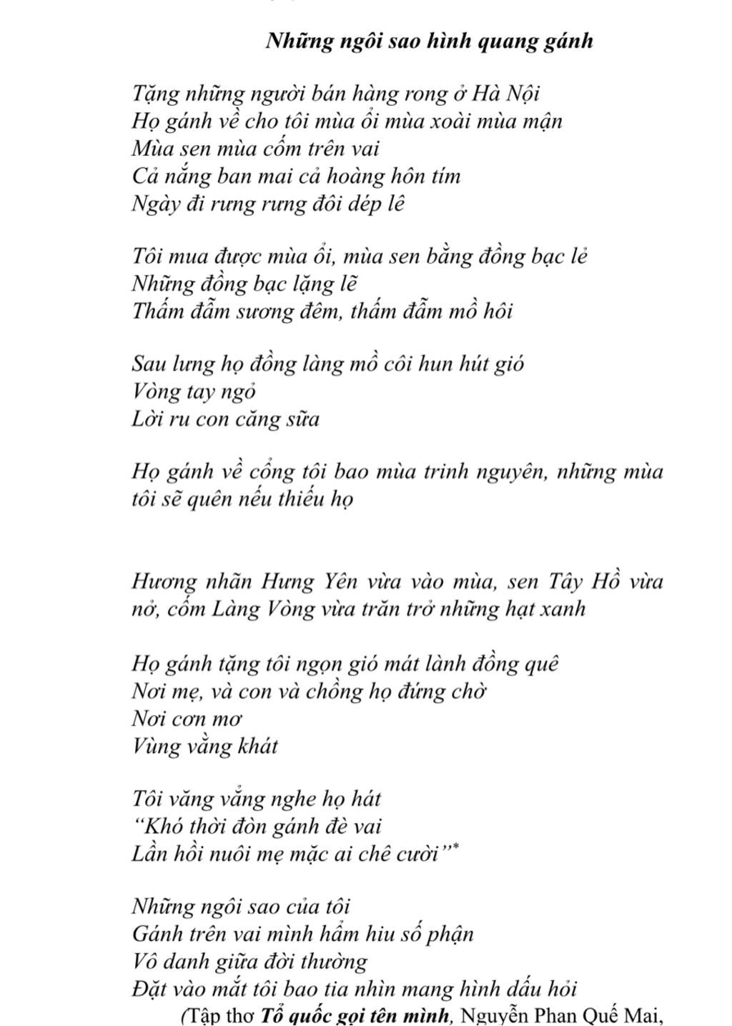 - "Những ngôi sao hình quang gánh" là một trong những bài thơ tiêu biểu của Nguyễn Quế Mai, được in trong tập thơ "Mùa lá rụng" (1995)