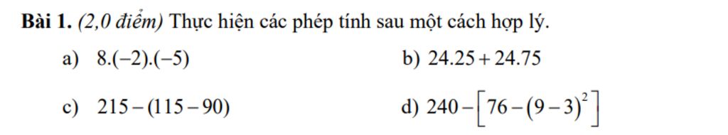 Bài 1. (2,0 điểm) Thực hiện các phép tính sau một cách hợp lý.