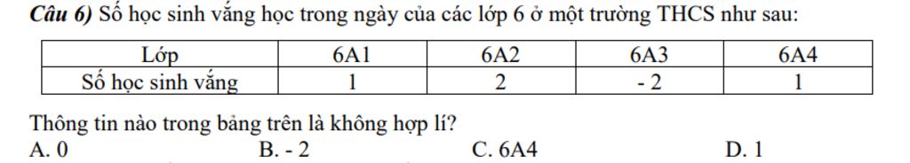 `@` Thông tin không hợp lí vì số học sinh phải là số tự nhiên khác `0` mà `-2 <0` nên không hợp lí