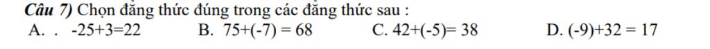 `75 + (-7) = 75 - 7 = 68` (đúng)