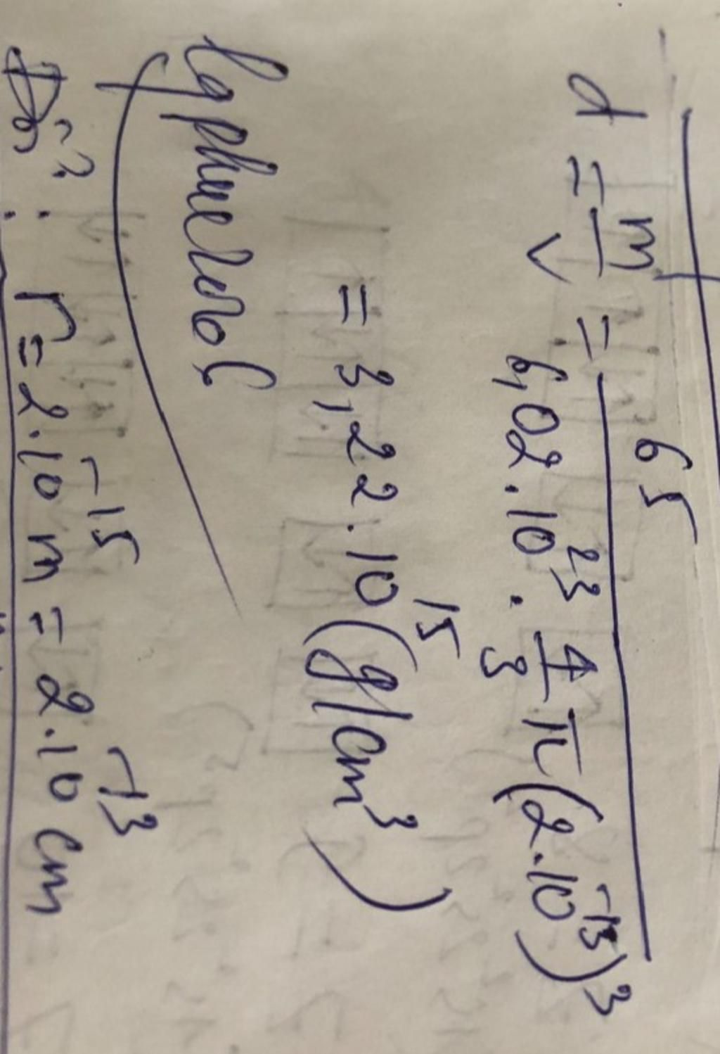 Nguyên từ zinc (Zn) có khối lượng nguyên tử bằng 65 amu. Thực tế hầu như toàn bộ khối lượng nguyên từ tập trung ở hạt nhân, với bán kính r = 2.10^-15m. Khối lượng riêng của hạt nhân nguyên tử zinc là bao nhiêu (g/cm³).