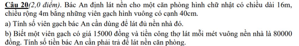 `b)` Số tiền bác An cần phải trả để lát nền căn phòng là: