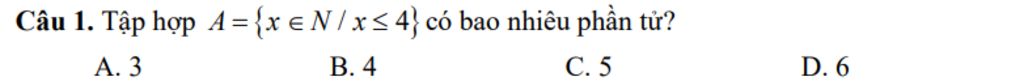 Câu 1. Tập hợp A={x∈N/x≤4} có bao nhiêu phần tử?