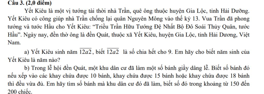 Câu 3. (2,0 điểm) Yết Kiêu là một vị tướng tài thời nhà Trần, quê ông thuộc huyện Gia Lộc, tỉnh Hải Dưỡng. Yết Kiêu có công giúp nhà Trần chống lại quân Nguyên Mông vào thế kỷ 13. Vua Trần đã phong tướng và tước Hầu cho Yết Kiêu: “Triều Trần Hữu Tướng Đệ Nhất Bộ Đô Soái Thủy Quân, tước Hầu”. Ngày nay, đền thờ ông là đền Quát, thuộc xã Yết Kiêu, huyện Gia Lộc, tỉnh Hải Dương, Việt Nam. a) Yết Kiêu sinh năm 12a2, biết 12a2 là số chia hết cho 9. Em hãy cho biết năm sinh của Yết Kiêu là năm nào? b) Trong lễ hội đền Quát, một khu dân cư đã làm một số bánh giầy dâng lễ. Biết số bánh đó nếu xếp vào các khay chứa được 10 bánh, khay chứa được 15 bánh hoặc khay chứa được 18 bánh thì đều vừa đủ. Em hãy tìm số bánh mà khu dân cư đó đã làm, biết số đó trong khoảng từ 150 đến 200 chiếc.