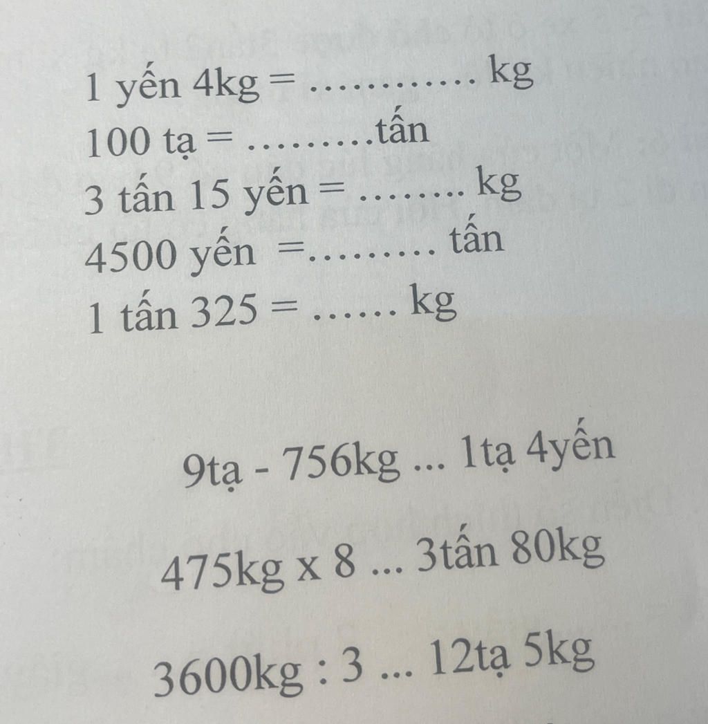 `9` tạ `- 756` kg `>` `1` tạ `4` yến