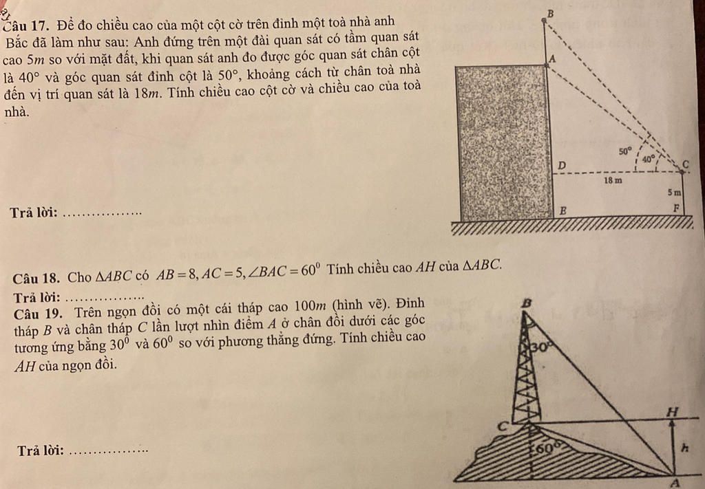 $\tan40^o=\dfrac{AD}{CD}=\dfrac{AD}{18}\to AD=18\tan40^o\approx 15.1(m)$