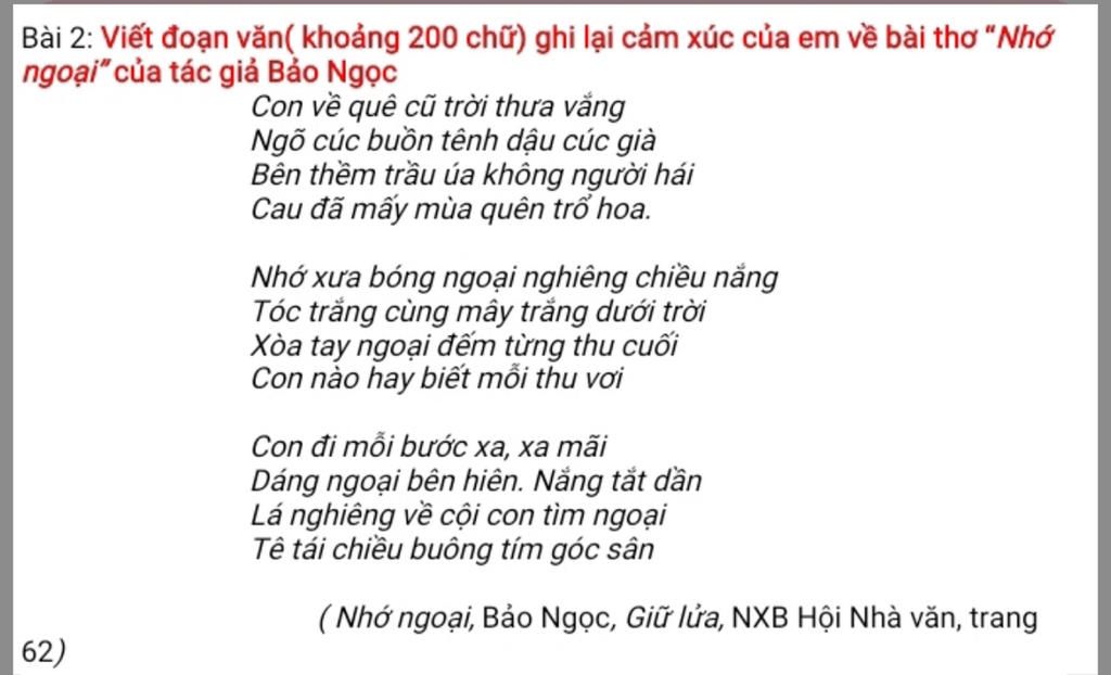 Bài 2: Viết đoạn văn( khoảng 200 chữ) ghi lại cảm xúc của em về bài thơ “Nhớ