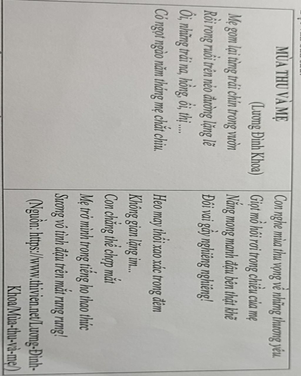 Viết đoạn văn (khoảng 200 chữ) phân tích khổ thơ cuối của văn bản Mùa thu và mẹ trong phần đọc hiểu.