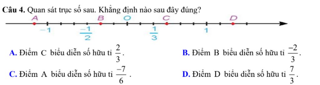 Điểm `B` biểu diễn số hữu tỉ `(-2)/6= (-1)/3`