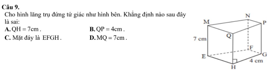 Vì các mặt bên của hình lăng trụ đứng tứ giác là hình chữ nhật mà ta thấy hình bên có mặt đáy là: `EFGH` và `MNPQ`