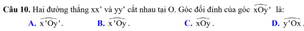 `-`Góc đổi đỉnh với `hat(xOy')` là `hat(x'Oy)`(Vì `2` góc này không chung `1` đoạn thẳng)