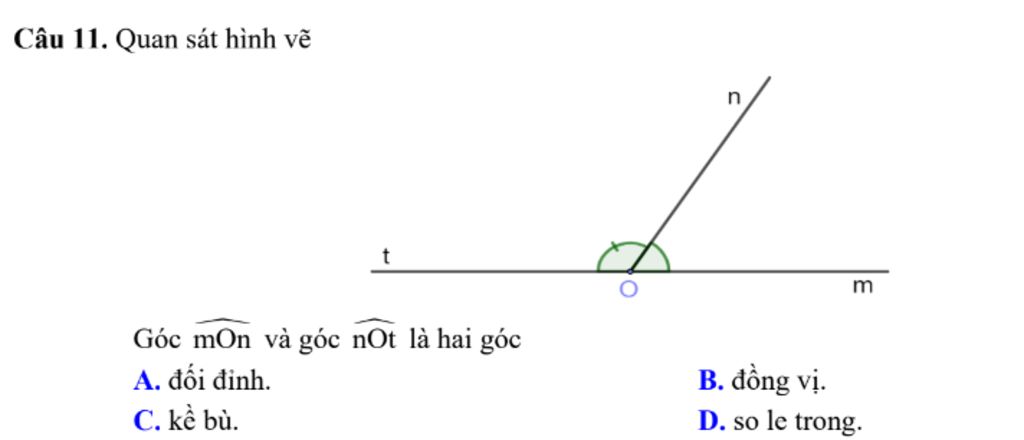 Góc $\widehat{mOn}$ và góc $\widehat{nOt}$ là hai góc kề bù