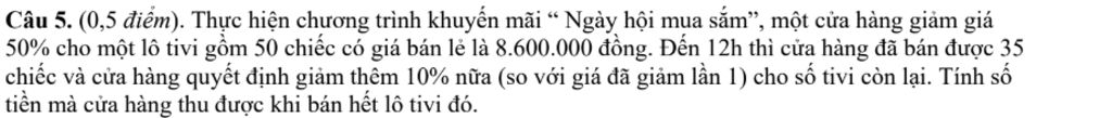 Số tiền cửa hàng thu được khi bán `15` chiếc tivi còn lại là `:`