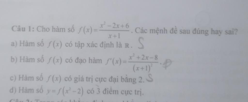 Ta có: `f^'(x)=(x^2-2x+6)/(x+1); f^'(x)=0<=>[(x=2),(x=-4):}`