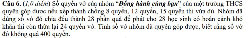 Câu 6. (1,0 điểm) Số quyển vở của nhóm “Đồng hành cùng bạn” của một trường THCS quyên góp được nếu xếp thành chồng 8 quyển, 12 quyển, 15 quyển thì vừa đủ. Nhóm đã dùng số vở đó chia đều thành 28 phần quà để phát cho 28 học sinh có hoàn cảnh khó khăn thì còn thừa lại 24 quyển vở. Tính số vở nhóm đã quyên góp được, biết rằng số vở đó không quá 400 quyển.