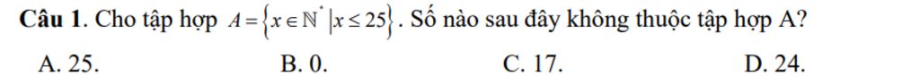 Câu 1. Cho tập hợp 4= {x∈N|x≤25. Số nào sau đây không thuộc tập hợp A?