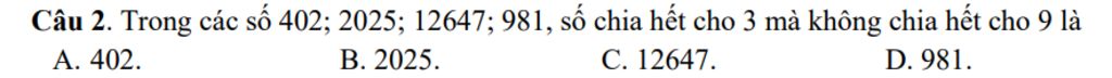 `2025= 2+0+2+5= 9` chia hết cho `3` và `9` nhưng không phải yêu cầu của đề bài