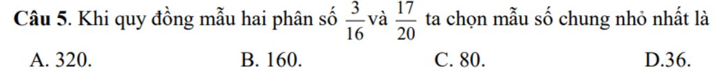Câu 5. Khi quy đồng mẫu hai phân số $\frac{3}{16}$ và $\frac{17}{20}$ ta chọn mẫu số chung nhỏ nhất là