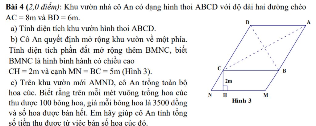 Bài 4 (2,0 điểm): Khu vườn nhà cô An có dạng hình thoi ABCD với độ dài hai đường chéo AC = 8m và BD = 6m.