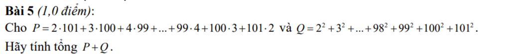Bài 5 (1,0 điểm): Cho P=2.101+3.100+4.99+...+99.4+100.3+101.2 và Q=$2^{2}$ +$3^{2}$ +...+$98^{2}$ +$99^{2}$ +$100^{2}$ +$101^{2}$ . Hãy tính tổng P+Q.