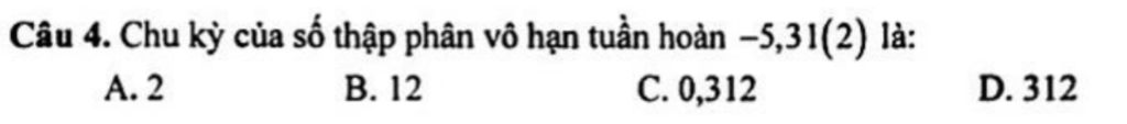 `-5,31(2)` có chu kỳ của phần thập phân tuần hoàn là `2`