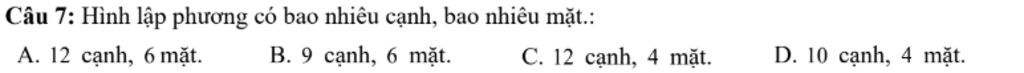 `-` Hình lập phương có `4 .3 = 12` (cạnh) và `6` mặt