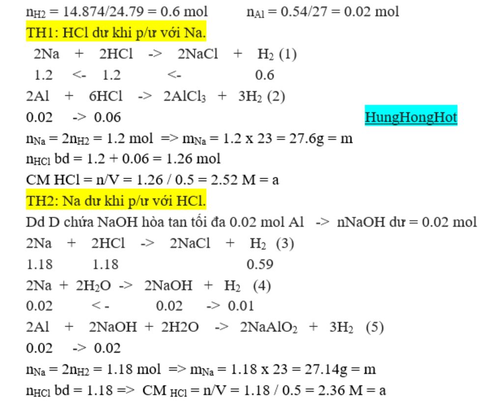 Cho m gam Na vào 500ml dung dịch HCl a M. Khi phản ứng xảy ra hoàn toàn thu được 14,874 lít H2 ở đkc và dung dịch D. Dung dịch D có khả năng hòa tan 0,54g Al. Tính giá trị của a, m?