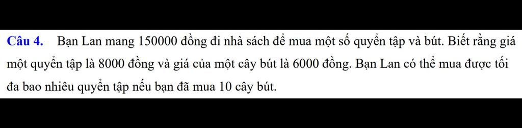 `text{ Vậy Lan có thể mua tối đa là 11 quyển tập`