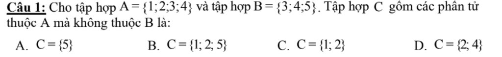 Câu 1: Cho tập hợp A= {1;2;3;4} và tập hợp B = {3;4;5}. Tập hợp C gồm các phân tử