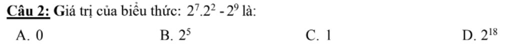 Câu 2: Giá trị của biểu thức: $2^{7}$ . $2^{2}$ - $2^{9}$ là: