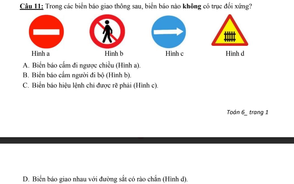 Hình d (biển báo giao nhau với đường sắt có rào chắn): Hình tam giác với hình vẽ đường ray, không có trục đối xứng rõ ràng.