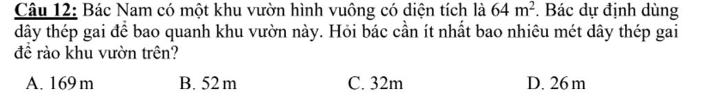 Câu 12: Bác Nam có một khu vườn hình vuông có diện tích là 64 $m^{2}$ . Bác dự định dùng dây thép gai để bao quanh khu vườn này. Hỏi bác cần ít nhất bao nhiêu mét dây thép gai để rào khu vườn trên?