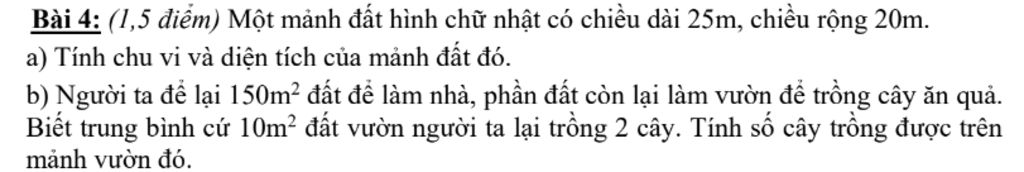 Bài 4: (1,5 điểm) Một mảnh đất hình chữ nhật có chiều dài 25m, chiều rộng 20m.