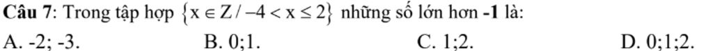 Câu 7: Trong tập hợp {x∈Z/−4<x≤2} những số lớn hơn -1 là: