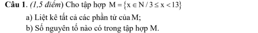 Câu 1. (1,5 điểm) Cho tập hợp M= {x∈N/3≤x<13}