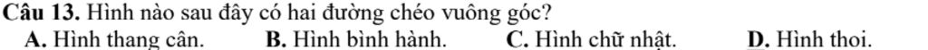 Hình có `2` đường chéo vuông góc là : Hình vuông và hình thoi