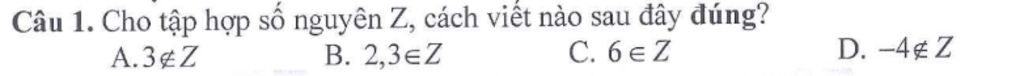 Câu 1. Cho tập hợp số nguyên Z, cách viết nào sau đây đúng?