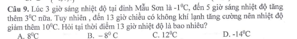 Câu 9. Lúc 3 giờ sáng nhiệt độ tại đỉnh Mẫu Sơn là -1C, đến 5 giờ sáng nhiệt độ tăng thêm 3C nữa. Tuy nhiên, đến 13 giờ chiều có không khí lạnh tăng cường nên nhiệt độ giảm thêm 10C. Hỏi tại thời điểm 13 giờ nhiệt độ là bao nhiêu?