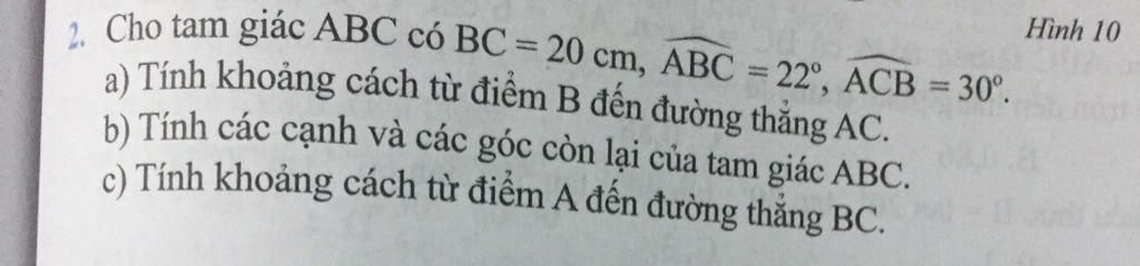 *. Cho tam giác ABC có BC=20 cm, ABC = 22°, ACB = 30°.