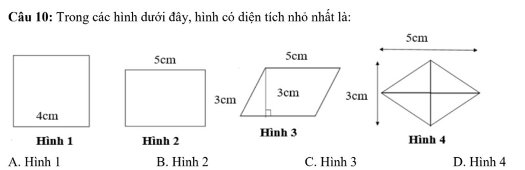 Câu `10` :Trong các hình dưới, hình có diện tích nhỏ nhất là: