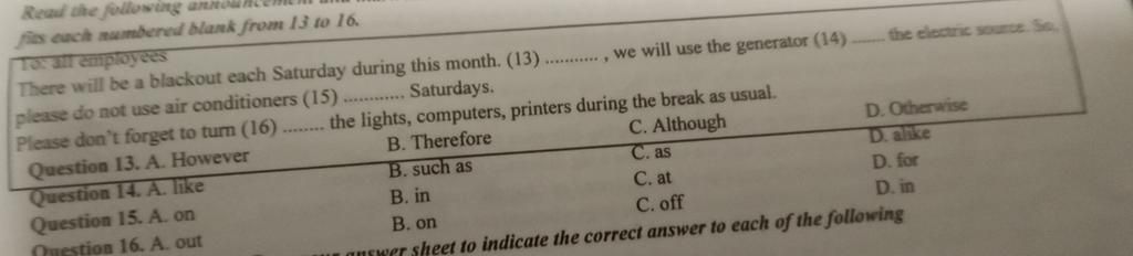`-` Tạm dịch: Sẽ có một lần mất điện vào mỗi thứ Bảy trong tháng này. Do đó, chúng tôi sẽ sử dụng máy phát điện làm nguồn điện.