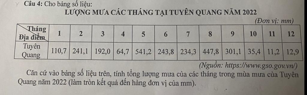Tổng lượng mưa của các tháng trong mùa mưa của Tuyên Quang là `:`